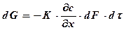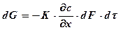 Это уравнение может быть выведено в результате следующих рассуждений. К элементарной площадке dF на границе раздела фаз подводится вещество из твёрдой фазы в количестве dG, которое можно определить, исходя из закона массопроводности (внутренний массоперенос) (6.27).