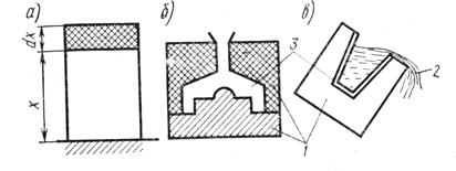 Скорость набора черенка зависит от скорости влагообмена между литьевой массой и формой, то есть скоростью отсоса влаги. Процесс «набора черепка» можно описать математически. Пусть х – толщина слоя черепка (рис.8.9, а), a dx – прирост ее за время dt. По мере возрастания х величина dx будет уменьшаться вследствие поглощения воды поддоном из-за тормозящего действия увеличивающегося фильтрующего слоя.