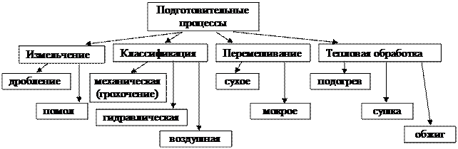 Подготовительные процессы сопутствуют производству практически любого строительного материала. Основная задача подготовительных процессов заключается в раскрытии потенциальных возможностей исходного сырья. В зависимости от вида подготавливаемого сырья и специфичности вырабатываемого готового продукта подготовительные операции носят различный характер. На рис. 9.1 приведена классификация подготовительных процессов.