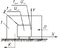 Бетон в виде модельного параллелепипеда 2 (рис. 10.2) поместим в установку 1. Обозначим температуру и влагосодержание материала на поверхности соответственно tп.м. и UП.М. и в центре tц.м. и UЦ.М. В установку подадим пар П и из установки будем выводить конденсат К. Рассмотрим процесс внешнего тепло- и массообмена между паром и материалом.