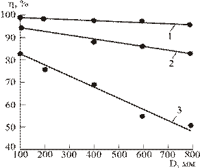 На рис. П3.2 показана зависимость степени улавливания η от диаметра циклона D при различных диаметрах частиц пыли d. График составлен для пыли с плотностью 2300 кг/ м3 при Δ p/ρ = 740 м2/с2.