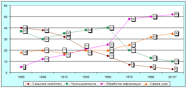 Наиболее впечатляющие темпы роста вовлеченности людей в деятельность основных секторов экономики отмечаются в сфере обработки информации, где удельный вес вовлеченности изменился с 5% в 1860 г. до 50% в 2000 г. (рис. 1.1). В сфере услуг этот показатель вырос почти в 2 раза – с 18 в 1860 г. до 32% в 2000 г.