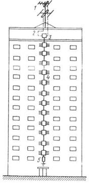 1 - приемная антенна; 2 - кабели снижения; 3 - соединительная коробка; 4 - стояк с распределительными поэтажными коробками и абонентскими ответвлениями; 5 - нагрузочное