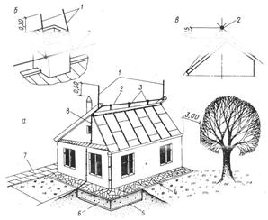 а-общий вид; б-крепление «вилки» на трубе; в-правильное расположение тросового молниеприемника; 1-стержневой молниеприемник; 2-тросовый молниеприемник; 3-стойки; 4-отмостка; 5-заземлитель; 6-зона увлажнения; 7-пешеходная дорожка; 8-токоотвод.