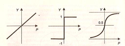 Передаточная функция, или функция активации нейрона, является правилом, согласно которому взвешенная сумма поступивших сигналов P преобразуется в выходной сигнал нейрона Y, который передается другим нейронам сети, т. е. Y=f(P). На рисунке 2.3 показаны графики наиболее распространённых функций активации нейронов.