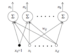 В 1958 г. Фрэнк Розенблатт предложил следующую модель нейронной сети – персептрона. Персептрон Розенблатта (рис. 2.4) состоит из k нейронов, имеет d входов, k выходов и только один слой настраиваемых весов wij.