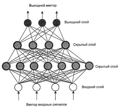 Для решения нелинейных проблем предложены модели многослойных персептронов (MLP), способные строить ломаную границу между распознаваемыми образами. В многослойных сетях каждый нейрон может посылать выходной сигнал только в следующий слой и принимать входные сигналы только с предыдущего слоя, как показано на рисунке 2.6. Слои нейронов, расположенные между входным и выходным называются скрытыми, так как не получают и не передают данные непосредственно из внешней среды. Такая сеть позволяет выделять глобальные свойства данных за счет наличия дополнительных синаптических связей и повышения уровня взаимодействия нейронов.
