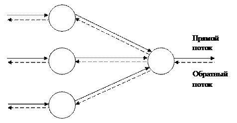 Алгоритм обратного распространения определяет два потока в сети: прямой поток, от входного слоя к выходному, и обратный поток – от выходного слоя к входному. Прямой поток, также называемый функциональным потоком, продвигает входные сигналы через сеть, в результате чего в выходном слое получаются выходные значения сети. Обратный поток подобен прямому, но продвигает назад по сети значения ошибок, в результате чего определяются величины, в соответствии с которыми следует корректировать весовые коэффициенты в процессе обучения. В обратном потоке значения проходят по взвешенным связям в направлении, обратном направлению прямого потока. Наличие двойного потока в сети иллюстрирует рис. 3.2.