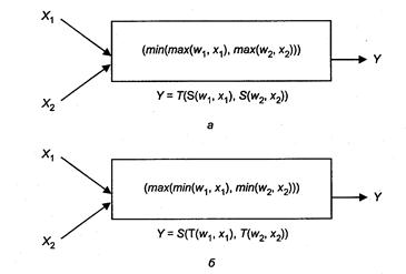 И-нейроном называется нейрон, в котором умножение веса w на вход х моделируется конормой S(w, x), а сложение нормой T(w, x). Для двухвходового И-нейрона справедлива формула: