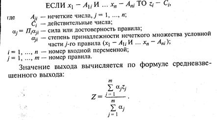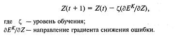 Допустим, что разработана нейросеть с п входами и одним выходом. Каким образом такая НС может аппроксимировать базу нечетких правил? Любая совокупность нечетких продукций может рассматриваться как нелинейное соответствие, заданное таблицей определения {(xk, yk}}, где k= 1,..., К – номер строки-образца в обучающей выборке, х – вектор входа, у – желаемое значение выхода, a z – значение выхода, вычисляемое нейросетью. Если определить текущую ошибку с помощью формулы