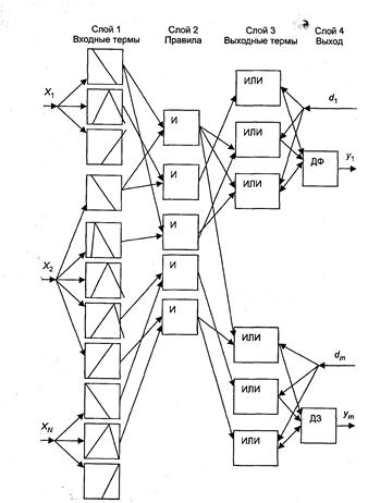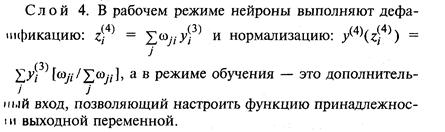 Слой 3 представляет собой ИЛИ - комбинацию правил со знаковыми термами в консеквентах и выполняет разные функции в рабочем режиме и в режиме обучения. В режиме обучения слой настраивает параметры функций принадлежности выходных переменных. В рабочем режиме формирует назначение выхода.