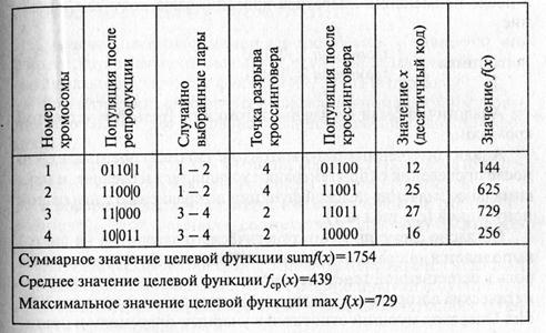 После репродукции выполняется оператор кроссинговера, который может повторяться несколько раз. При этом каждый раз будет осуществляться выбор двух кандидатур из множества хромосом. Затем каждая пара хромосом пересекается. Место пересечения К выбирается случайным образом на интервале (1, L-1), где L – длина хромосомы, определяемая количеством значащих цифр в ее двоичном коде. В нашем случае L = 5. Две новые хромосомы создаются путем взаимного обмена всех значений после точки пересечения, т.е. между позициями (К+1) и L. При выборе двух первых хромосом из популяции (см. табл) и значения К = 4 до применения оператора кроссинговера имеем описание: