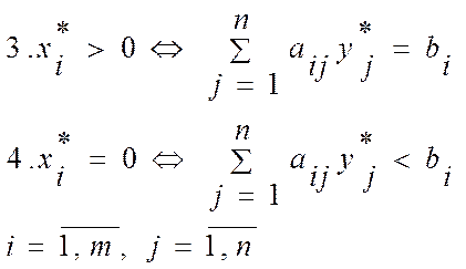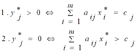 Вторая теорема двойственности. Для того чтобы пара планов x*, y* была оптимальной в прямой и двойственной задачах соответственно, необходимо и достаточно, чтобы выполнялись следующие условия: