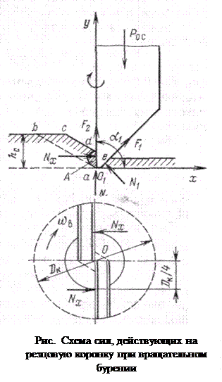 При вращательном бурении порода разрушается под действием осевого усилия подачи Рос и крутящего момента, передаваемого станком резцовой коронке (рис.). При этом осевое усилие должно преодолеть сопротивление