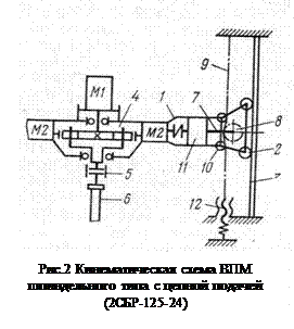Вращательно-подающий механизм шпиндельного типа с канатной подачей станка вращательного бурения 2СБР-125-30 (рис.2) представляет собой стальную раму 1, на которой смонтированы механизмы вращения, буровой став и два механизма подачи. На неподвижных осях на раме установлены ролики 2, с помощью которых рама ВПМ может перемещаться по направляющим мачты 3. Вал гидродвигателя Ml через планетарный редуктор 4 с выходным шлицевым