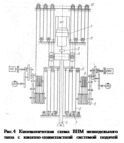 Вращательно - подающий механизм шпиндельного типа с канатно-полиспастной системой подачи показан на рис.4. Вращение бурового става осуществляется от двигателя Ml постоянного тока через двухступенчатый редуктор 1 и шинно-зубчатую муфту 2. Принципиальное устройство вращателя станка СБШ-320-36 аналогично устройству вращателя станка СБШ 250МНА-32. Осевое усилие до 0,6 МН на буровой став 3 передается через опорный узел 4 двумя канатами 5, образующими 5-кратные нижние полис пасты. Подвижные блоки 6 полиспастов установлены на раме опорного узла, а неподвижные блоки 7 закреплены на мачте. Канаты 5 огибают желобчатые барабаны 8 и 9 лебедок подачи и далее идут к неподвижным блокам 10,