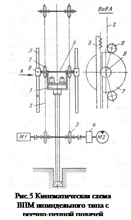 Вращательно-подающий механизм шпиндельного типа с реечно-цепной подачей (рис.5) имеет на подвижной каретке вращатель 1 с приводом от одного или двух электродвигателей постоянного тока. Подача осуществляется с помощью замкнутой роликовой цепи 2, перемещаемой звездочкой 3, связанной через редуктор 4 с гидродвигателем М2. Две звездочки 6 установлены для увеличения угла обхвата и снижения усилий на зубья подвижной звездочки 7, расположенной на валу 8. Две шестерни 9, размещенные на концах вала 8, перекатываются по неподвижным рейкам 5, укрепленным по всей длине мачты. Большое усилие в реечном зацеплении при сравнительно небольшом усилии в цепях достигается благодаря малому диаметру шестерен 9 и большому диаметру подвижных звездочек 7. Для ускоренного подъема и опускания подвижной каретки установлен электродвигатель постоянного тока Ml, с помощью которого создается весьма высокая скорость холостого хода — 27,5 м/мин, что сокращает время вспомогательных операций. Переключение с электродвигателя на гидродвигатель М2 сблокировано.