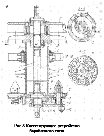 Кассетирующее устройство барабанного типа (рис.8) служит для размещения восьми 3-метровых буровых штанг и состоит из невращающейся оси 1 на которую надета поворотная часть, состоящая из трубы 2 с нижней плитой 3, поддерживающей опоры 4 и верхней обоймы 5. На нижней плите размещены шестигранники 6, навинченные на оси 7 и прижимаемые пружинами 8 к торцам фланцев 9. Буровые штанги устанавливаются в кассете вертикально и надеваются своими внутренними шестигранниками на шестигранники 6. При этом верхние концы штанг удерживаются пружинными захватами 10, а также обоймами 5 и 11. На нижнем конце оси 1 свободно посажено храповое колесо 12, в зацепление с которым входят собачки 13, жестко связанные с нижней плитой кассеты. Рычаг 14, соединенный с храповым колесом, имеет ролик 15, который при перемещении двумя гидроцилиндрами, укрепленными на мачте, на ось скважины и обратно взаимодействует с упорами на раме и поворачивает плиту 3 через собачки 13 на угол 45°. Плита удерживается от поворота шариковыми фиксаторами 16.