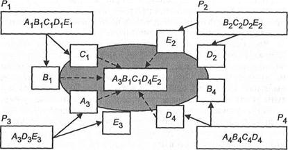 Задача оптимального распределения множества работ (подпроцессов) среди множества работников (реальных предприятий) в исследовании операций формулируется как задача о назначениях [5]. Ее решение начинается с формирования множеств подпроцессов и потенциальных предприятий-участников. Затем строятся возможные отображения из множества участников на множество подпроцессов и делается выбор наиболее приемлемого отображения, которое соответствует конкретным назначениям предприятий на бизнес-процессы. Для этого можно использовать механизм аукциона. На рис. 7.2 приведена схема аукциона по созданию виртуального предприятия, в котором выделены бизнес-процессы А, В, С, D, Е и участвуют четыре предприятия: Р1, Р2, Р5, P4, претендующие на их реализацию. Каждое из предприятий представлено интеллектуальным агентом, при этом одно из них (Рх) выступает в роли инициатора (аукционера).
