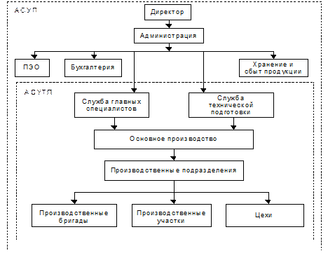 Администрация со своими службами управляет, планирует и регулирует основное производство, которое состоит из производственных подразделений, таких как производственные бригады, участки, цехи. В составе АСУП может быть выделена автоматизированная система управления технологическими процессами (АСУТП), охватывающая основное производство, где реализуются технологические процессы, и службу главных специалистов.