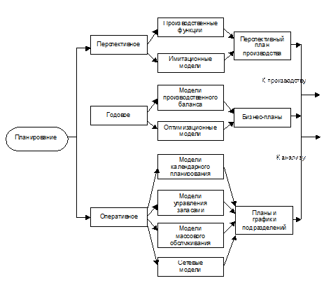 Если комплекс задач перспективного планирования решается в основном для предприятия в целом и оперирует агрегированной информацией, то комплекс задач годового планирования решается в различных модификациях как для предприятия в целом, так и для его производственных подразделений. На оперативном уровне планирования производства используются модели календарного планирования, управления запасами, теории массового обслуживания, сетевые модели, модели математического программирования. Результатом решения задач этого комплекса являются планы и графики работ производственных подразделений.