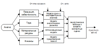На этой фазе решаются задачи по анализу состояния отдельных параметров производственного процесса по отношению к заданным значениям (плану). Это задачи анализа себестоимости выпускаемой продукции, трудовых ресурсов и трудозатрат, состояния материальных и финансовых ресурсов (рис. 11). На логическом уровне эти задачи описываются математическими моделями одно- и многофакторного анализа, аналитических и оптимизационных расчетов.