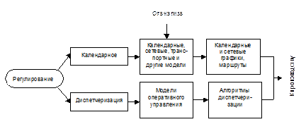 Для формального описания задач регулирования привлекаются методы и модели календарного и сетевого планирования, транспортные модели и модели оперативного управления. Выходной информацией этой фазы являются календарные и сетевые графики производства продукции, маршруты, алгоритмы диспетчеризации.