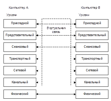 Разные уровни систем не взаимодействуют друг с другом напрямую, а только через физический уровень. Постепенно переходя с верхнего уровня на нижний, данные непрерывно преобразуются и снабжаются дополнительной информацией, которая анализируется протоколами соответствующего уровня на стороне получателя. Это создает эффект виртуального взаимодействия уровней между собой.