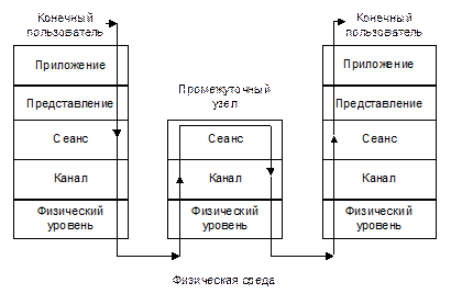 На рис. 18. показан пример конкретной многоуровневой архитектуры компьютерной сети. Между отправителем информации и получателем включен промежуточный узел. Пакет, поступающий по физической среде, связывающей исходный узел с промежуточным, направляется на сетевой уровень этого узла, на котором определяется следующая часть пути в составе маршрута через сеть.