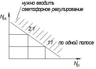 Светофорное регулирование вводится, если в течение 8 часов суммарно рабочего дня недели интенсивности Nгл+Nвт превышают значения, заданные ГОСТом.