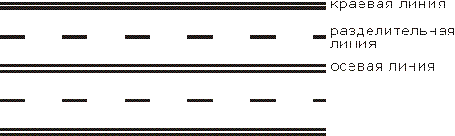 Линии, нанесенные вдоль дорожного полотна, включают в себя осевую линию, разделительную линию (разделяет полосы движения), краевую линию (обозначает кромку проезжей части). Осевая линия разделяет транспортные потоки противоположных направлений. Она может быть размечена как сплошная линия, как на перекрестках, или как линия приближения, или как линия проезжей части. Разделительная линия размечается белым цветом для разделения транспортных потоков в одном направлении. Она может быть использована также для резервирования полосы для определенных участников дорожного движения (например, общественного транспорта). Краевая линия размечена белым цветом вдоль кромки проезжей части. На дорогах низких категорий эта линия может быть прерывистой, а на дорогах высоких категорий она сплошная. Рис. 3.13.1 показывает три типа продольной разметки на примере дороги с несколькими полосами движения.