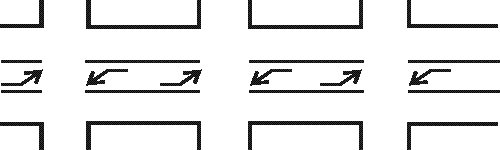 Зона левого поворота при двустороннем движении на дороге - это часть проезжей части выделяемая в в ее середине, предназначенная для транспортных средств, совершающих левый поворот. Применяется, в основном, в США на дорогах с несколькими полосами движения и на пересечениях в одном уровне с левосторонним движением высокой интенсивности (в Норвегии не применяется). Зона левого поворота показана на рис. 3.13.2.