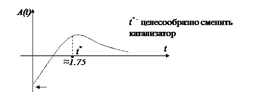 Видно, что с течением времени эффективность работы катализатора снижается и доход падает. Значит, в какой то момент времени надо сменить катализатор, что связано с остановкой реактора. Что в свою очередь дает свои потери. Следовательно, есть оптимальный момент времени, когда выгодно сменить катализатор. Составим функцию
