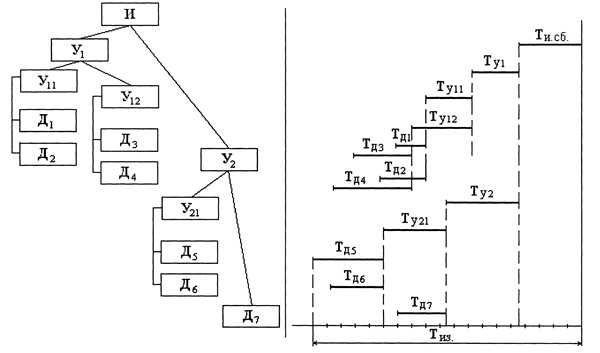 Цикловой график строится справа налево, где в масштабе времени откладываются циклы простых процессов, начиная от сборки изделия и кончая изготовлением деталей.