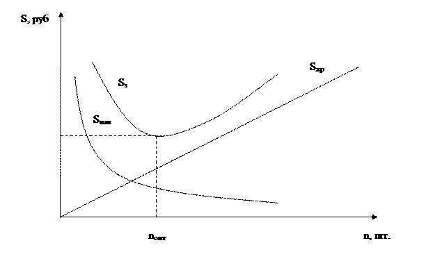 Размер обрабатываемой партии зависит от затрат на переналадку оборудования при смене наименования изделий и затрат, связанных с хранением запасов деталей и заготовок и характеризуется следующим графиком (рис 15.2).