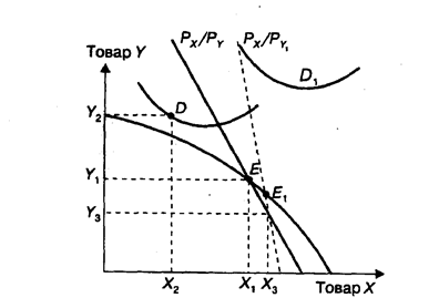 Рост Рх/Pу приводит к двум эффектам: эффекту дохода, означающему повышение благосостояния вследствие роста дохода от экспорта, и эффекту замещения, который означает рост потребления импортируемых товаров по сравнению с экспортируемыми.