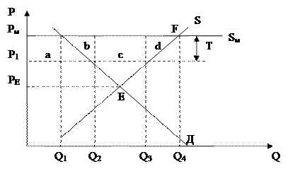 Экспорт теперь менее выгоден, производители часть поставок переориентируют на внутренний рынок. В результате цена падает до Р1 = Рм – Т.