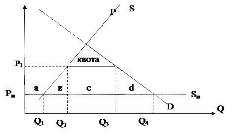 В случае с введением тарифа С переходит государству. В случае с квотой – импортирующим компаниям. Они покупают товар по мировой цене Рм, а продают по Р1.