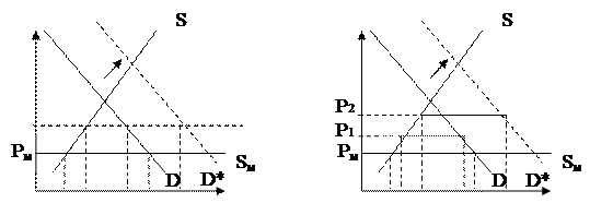 | Р1 = const. При росте спроса внутреннее производство не увеличится. Потребление увеличится с Q3 до Q5. Импорт увеличится с Q3-Q2 до Q5-Q2. | Импорт = const. Внутреннее Производство возрастет с Q2 до Q3 Внутреннее потребление с Q4 до Q6 Цена увеличится с Р1 до Р2 |