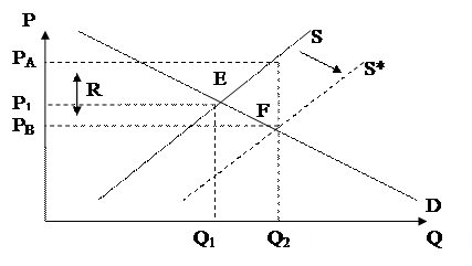 Правительство страны А ввело прямые субсидии либо снизило экспортерам налоги. В результате кривая предложения сдвинулась вправо – в положение S*. Экспортная цена снизилась до РВ – т.е. ухудшились условия торговли страны А. Но экспорт увеличился с Q1 до Q2. Если выгода от роста объема продаж перекрывает проигрыш от снижения цены, экспортеры страны А выигрывают. Но внутренние цены страны А увеличились, т.к. из-за роста экспорта на внутренний рынок поступает меньше товаров. Т.е. потребители страны А несут убытки. К тому же субсидии финансируются из бюджета за счет налогов. Вывод: с экономической точки зрения экспортные субсидии весьма спорны и скорее вредны.