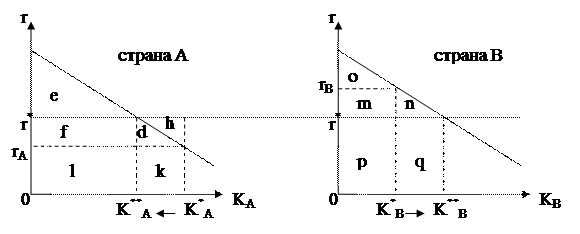 Перелив капитала будет продолжаться до тех пор, пока уровень r* не станет одинаковым для обеих стран. В стране А объем внутреннего капитала сократиться с К*А до К**А, в стране В увеличится с К*В до К**В.