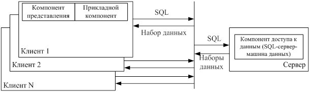 Прикладной компонент системы (библиотеки запросов, процедуры обработки данных) полностью размещается и выполняется на клиентской установке. При реализации своих функций прикладной компонент формирует необходимые SQL-инструкции, направляемые SQL-серверу. SQL-сервер, представляющий специальный программный компонент, ориентированный на интерпретацию SQL-инструкций и высокоскоростное выполнение низкоуровневых операций с данными, принимает и координирует SQL-инструкции от различных клиентов, выполняет их, проверяет и обеспечивает выполнение ограничений целостности данных и направляет клиентам результаты обработки SQL-инструкций, представляющие, как известно, наборы (таблицы) данных.