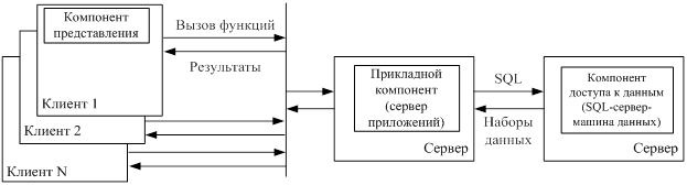 Как и в DBS-модели, на клиентских установках располагается только интерфейсная часть системы, т. е. компонент представления. Однако вызовы функций обработки данных направляются на сервер приложений, где эти функции совместно выполняются для всех пользователей системы. За выполнением низкоуровневых операций по доступу и изменению данных сервер приложений, как в RDA-модели, обращается к SQL-серверу, направляя ему вызовы SQL-процедур, и получая, соответственно, от него наборы данных.