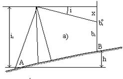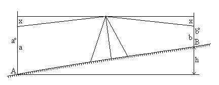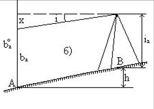 Ось цилиндрического уровня и визирная линия трубы должны быть параллельны и лежать в параллельных вертикальных плоскостях - это условие называется главным условием нивелира с уровнем при трубе. Первая часть главного условия проверяется двойным нивелированием вперед. На местности забивают два колышка на расстоянии около 50 м один от другого. Нивелир устанавливают над точкой А так, чтобы окуляр трубы находился на одной вертикальной линии с точкой (рис.14-а). От колышка до центра окуляра измеряют высоту инструмента i1. Затем рейку ставят в точку В, наводят на нее трубу нивелира, приводят пузырек уровня в нуль-пункт и берут отсчет по рейке b1. Затем нивелир и рейку меняют местами, измеряют высоту инструмента i2, приводят пузырек уровня в нуль-пункт и берут отсчет по рейке b2 (рис.14-б) Пусть главное условие нивелира не выполняется, и при положении пузырька уровня в нульпункте визирная линия не горизонтальна, а составляет с осью уровня некоторый угол i. Тогда вместо правильного отсчета b0 1 получается ошибочный - b1. Ошибку отсчета обозначим x, и превышение точки В относительно точки А будет равно: