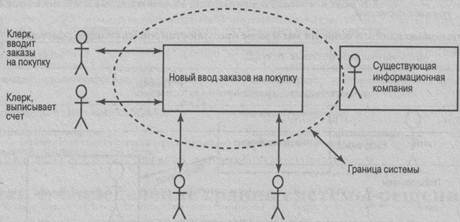Имея ответы на эти вопросы, аналитик может создать блок-схему, описывающую границы системы, пользователей и другие интерфейсы. На рис. 4.5 представлена новая система ввода заказов на покупку и ее окружение.