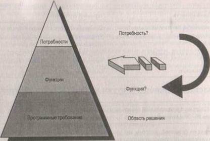 Что происходит при обсуждении? Пользователь уже преобразовал реальную потребность (производительность или безопасность) в поведение системы, которое, по его мнению, будет служить реальной потребности (рис. 8.1). При этом что ("Мне нужно"' незаметно заменилось на как ("что, по моему мнению, должна делать система, чтобы удовлетворить данную потребность"). Это неплохо, так как он имеет реальный опыт в данной предметной области и реальное понимание значения функции. Кроме того, такие функции легко обсуждать и документировать на обычном языке, а также объяснять их другим, что существенно обогащает схему требований.