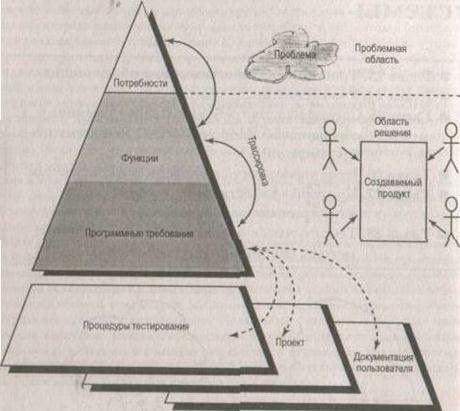 Предыдущие части были посвящены анализу проблемы, выявлению потребностей пользователей, сбору и документированию желаемых функций продукта и управления ими. После того как функции продукта определены, следующая задача состоит в уточнении спецификации до уровня детализации, пригодного для проведения процессов проектирования, написания программного кода и тестирования. Мы оказываемся в самом середине пирамиды требований, на уровне спецификации, как показано на рисунке.