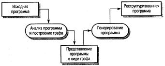 В известной работе [50] доказано, что любую программу можно переписать с помощью простых условных операторов if-then-else и циклов while-loop, при этом можно исключить все безусловные операторы перехода. Эта теорема является основой автоматической структуризации программ. Этапы такого преобразования программ показаны на рис 28. Сначала программа представляется в виде ориентированного граф, после чего создается структурированная программа без использования операторов перехода.