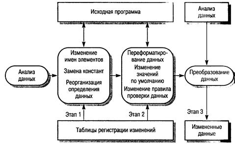 Перед изменением данных необходимо провести подробный анализ программ, которые работают с этими данными. Главная цель анализа — определение в программе деклараций функций, выявление литеральных величин, требующих заменены на именованные константы, поиск встроенных правил проверки данных. При анализе помогают такие средства, как анализаторы перекрестных ссылок и сопоставление с образцом. Для фиксации мест ссылок на элементы данных и изменений, которые там требуются, удобно создать набор таблиц регистрации изменений, которые содержат описание всех этапов изменения данных. Схема процесса изменения данных показана на рис. 28.8.