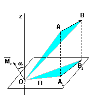 Треугольник OA1B1 является проекцией треугольника OAB на плоскость П. Из стереометрии известно, что площадь проекции плоской фигуры равна площади проецируемой фигуры, умноженной на косинус угла между плоскостями, в которых расположены эти фигуры (или косинус угла между нормалями к плоскостям этих фигур, т.е.